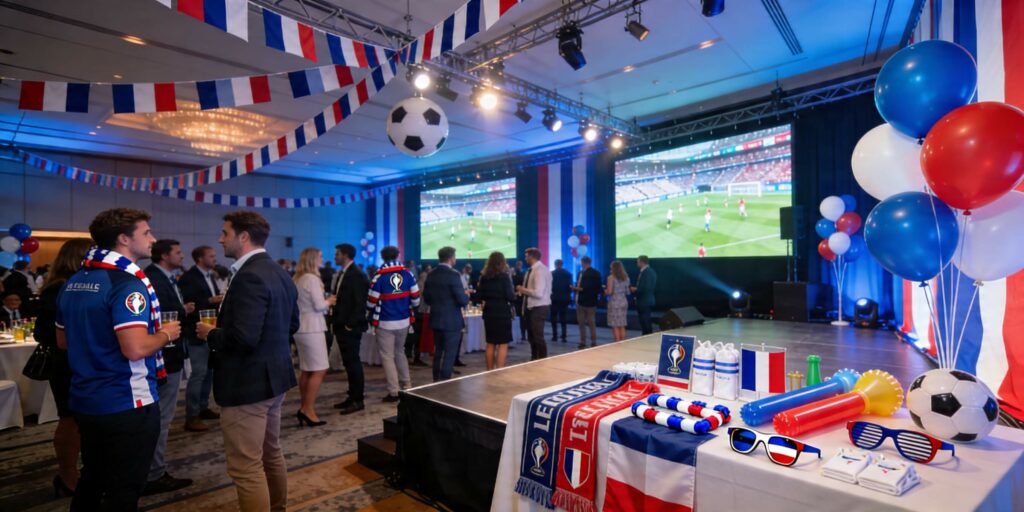Drapeaux français, guirlandes de fanions tricolores, ballons bleu blanc rouge, grand écran, lumière tamisée et espace convivial : l’ambiance se construit dans les détails. Et si votre identité visuelle s’intègre naturellement dans ce décor, vous transformez un simple événement en véritable expérience de marque.