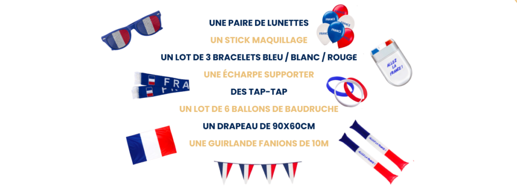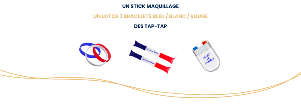 Pour un événement supporter, pensez aux objets qui s’utilisent sur le moment et se gardent ensuite. Une écharpe personnalisée, des bracelets tricolores, des tap-tap, un drapeau, des lunettes bleu blanc rouge ou encore un stick de maquillage : autant d’objets festifs et utiles qui créent l’ambiance tout en portant vos couleurs.